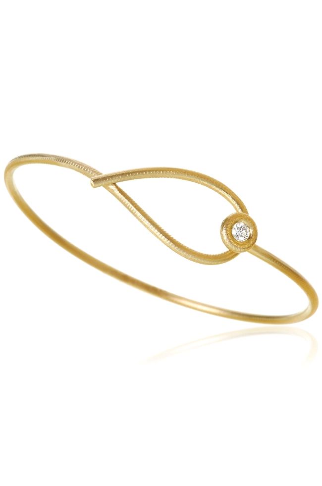 Dette Smukke armbånd kombinerer Kharisma øreringenes kurve og den svævende diamant fra Balloon smykkerne. Guldsmedene har håndfilet armbåndet, så det har den særlige rå og glamouriøse overflade, som karakteriserer Dulong smykkerne. Den Diamantbesatte lukning holder armbåndet på plads og giver den perfekte pasform. Smykket passer smukt til de andre smykker fra denne kollektion, men er også skabt til at blive båret med Dulong smykker på tværs af kollektionerne.